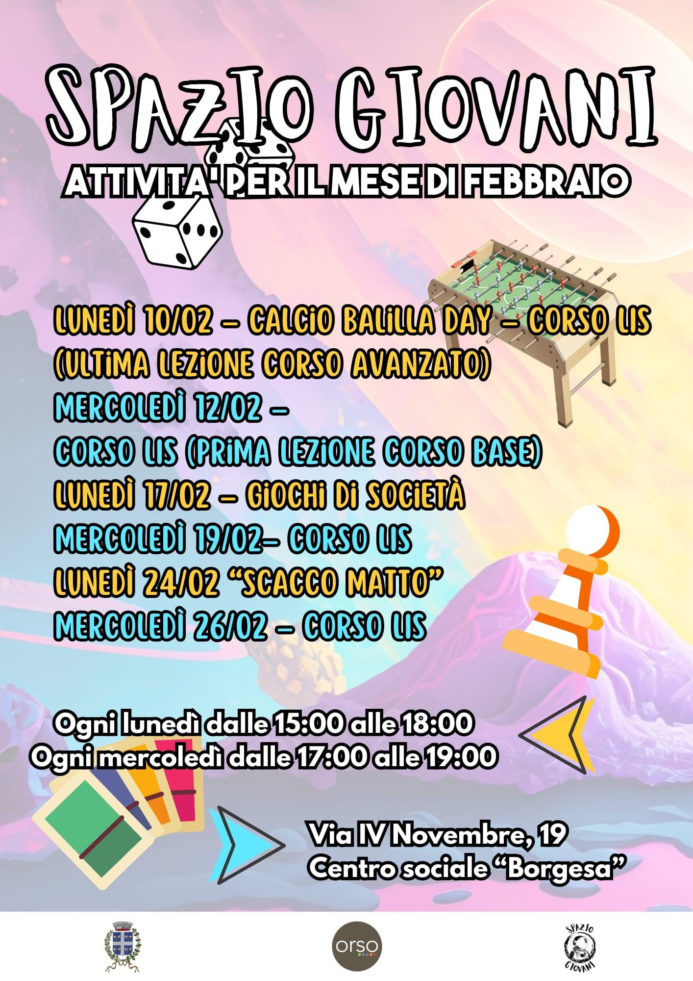 Avigliana, 8 febbraio 2025 – Sono state pianificate per il mese di febbraio 2025 le attività pensate per i giovani allo Spazio giovani di Avigliana presso il Centro sociale Borgesa alla Fabrica. Lunedì 10 sarà Calcio balilla day e si terrà l’ultima lezione del corso avanzato di Lingua dei segni italiana. Mercoledì 12 si svolgerà invece la prima lezione del corso di Lingua dei segni italiana base che proseguirà il 19 e il 26, mentre lunedì 17 è previsto un pomeriggio dedicato ai giochi di società. L’ultimo lunedì del mese, il 24 le attività saranno dedicate agli scacchi.