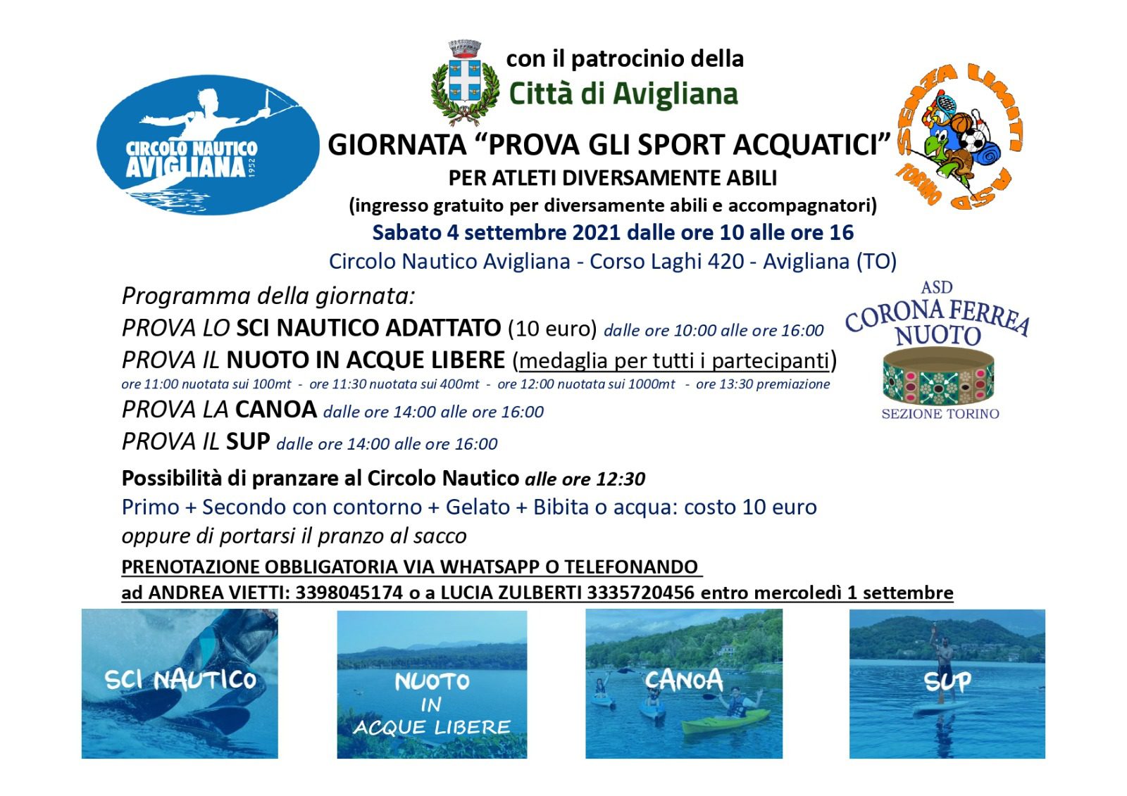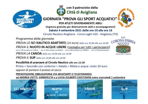 La giornata “Prova gli sport acquatici” si svolgerà sabato 4 settembre 2021 al Centro nautico Avigliana sul Lago Grande. Dalle 10 alle 16 sarà possibile provare lo sci nautico adattato (a un costo di 10 euro), il nuoto in acque libere, la canoa e il Sup (a partire dalle 14). Sarà possibile pranzare al circolo nautico con un prezzo fisso di 10 euro oppure portarsi il pranzo al sacco.