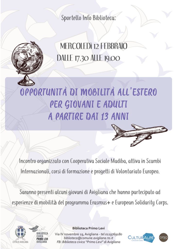 Lo sportello Infobiblioteca propone un incontro organizzato con la cooperativa sociale Madiba, attiva in scambi interni nazionali, corsi di formazione e progetti di volontariato europeo. Saranno presenti giovani di Avigliana che hanno partecipato a esperienze di mobilità del programma Erasmus+ e il Corpo europeo di solidarietà. L’appuntamento è per mercoledì 12 febbraio 2020 dalle 17,30 alle 19 alla biblioteca civica Primo Levi di Avigliana in via IV Novembre, 19 all’interno del centro polivalente La Fabrica.
