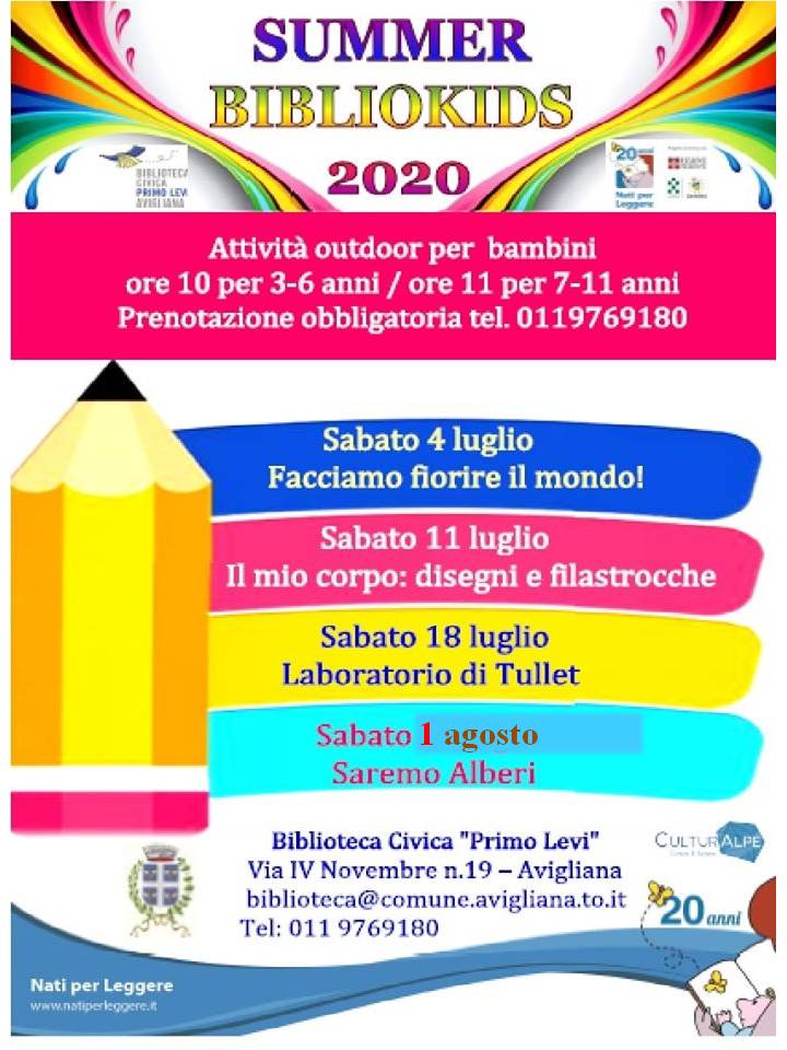 L’ultimo appuntamento estivo di Summer bibliokids, dedicato ai bambini in biblioteca, è stato spostato a sabato 1 agostoSummer bibliokidsNell’ambito della rassegna di incontri estivi per i più piccoli Summer bibliokids alla biblioteca civica Primo Levi di Avigliana, l’ultimo evento del 25 luglio dal titolo “Saremo alberi” è stato spostato a sabato 1 agosto.
