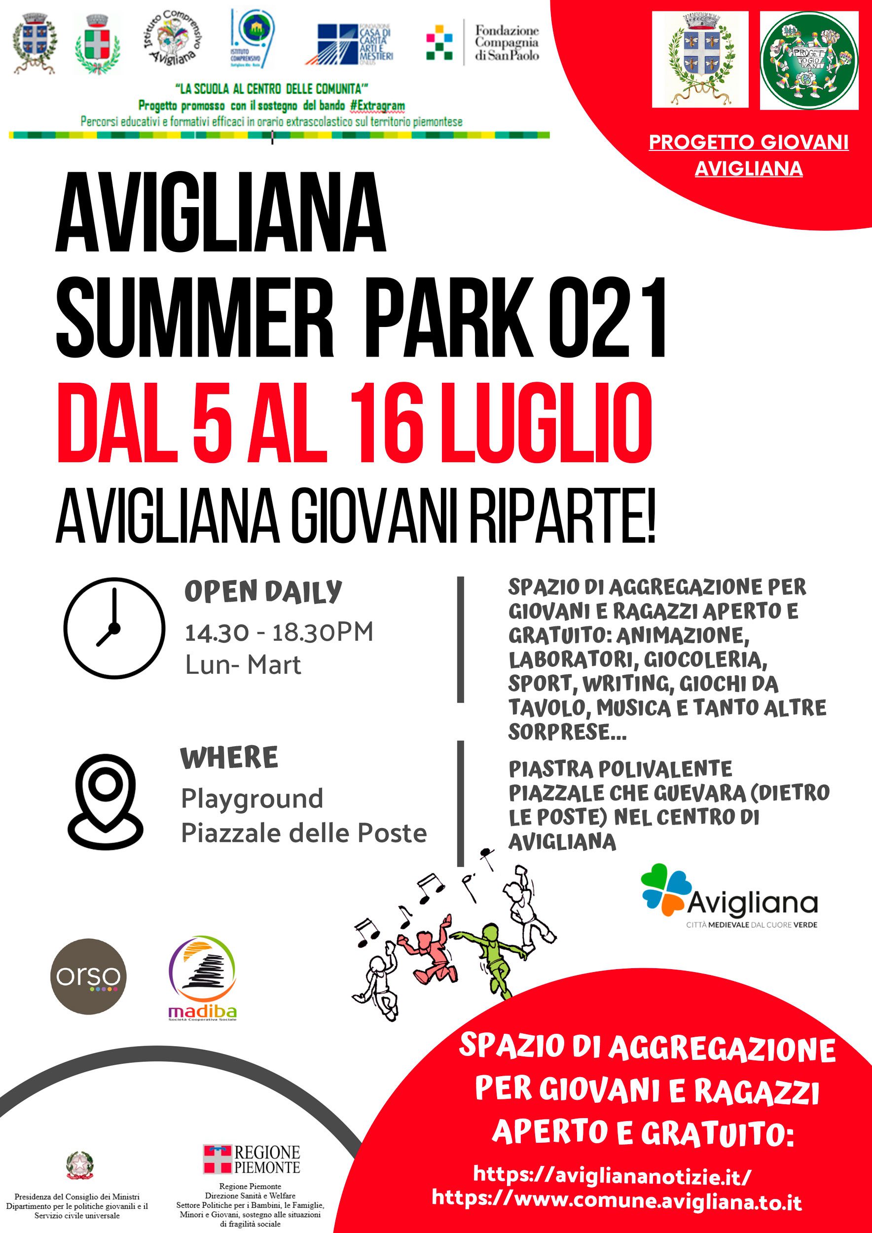Uno spazio di aggregazione per giovani e ragazzi, aperto e gratuito: animazione, laboratori, giocoleria, sport, writing, giochi da tavolo, musica e tanto altre sorprese. Il Summer park si svolge alla piastra polivalente di piazzale Che Guevara (dietro le poste) nel centro di Avigliana.