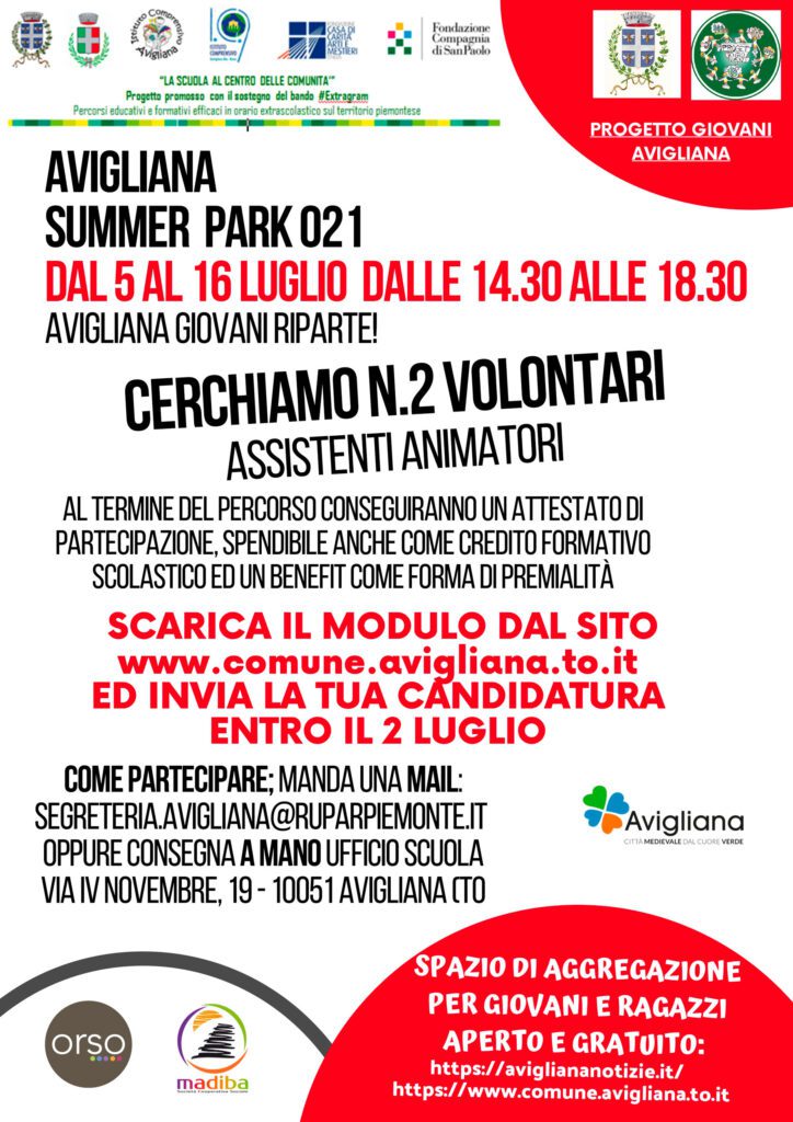 Si cercano 2 volontari assistenti animatori per il Summer park 021. Al termine del percorso conseguiranno un attestato di partecipazione, spendibile anche come credito formativo scolastico e un benefit come premio. Candidature entro il 2 luglio consegnando a mano il modulo di iscrizione all’ufficio scuola presso La Fabrica, via IV Novembre 19, Avigliana o mandando una mail a segreteria.avigliana@ruparpiemonte.it.