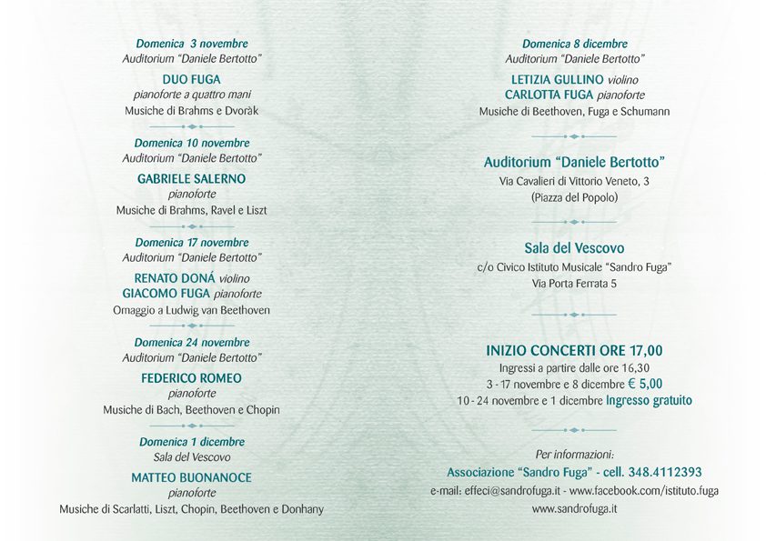 SEDI: 3,10,17,24 novembre e 8 dicembre Auditorium Daniele Bertotto, via Cavalieri di Vittorio Veneto 3, 1 dicembre sala Del Vescovo (presso Civico istituto Musicale Sandro Fuga), via Porta Ferrata 5.