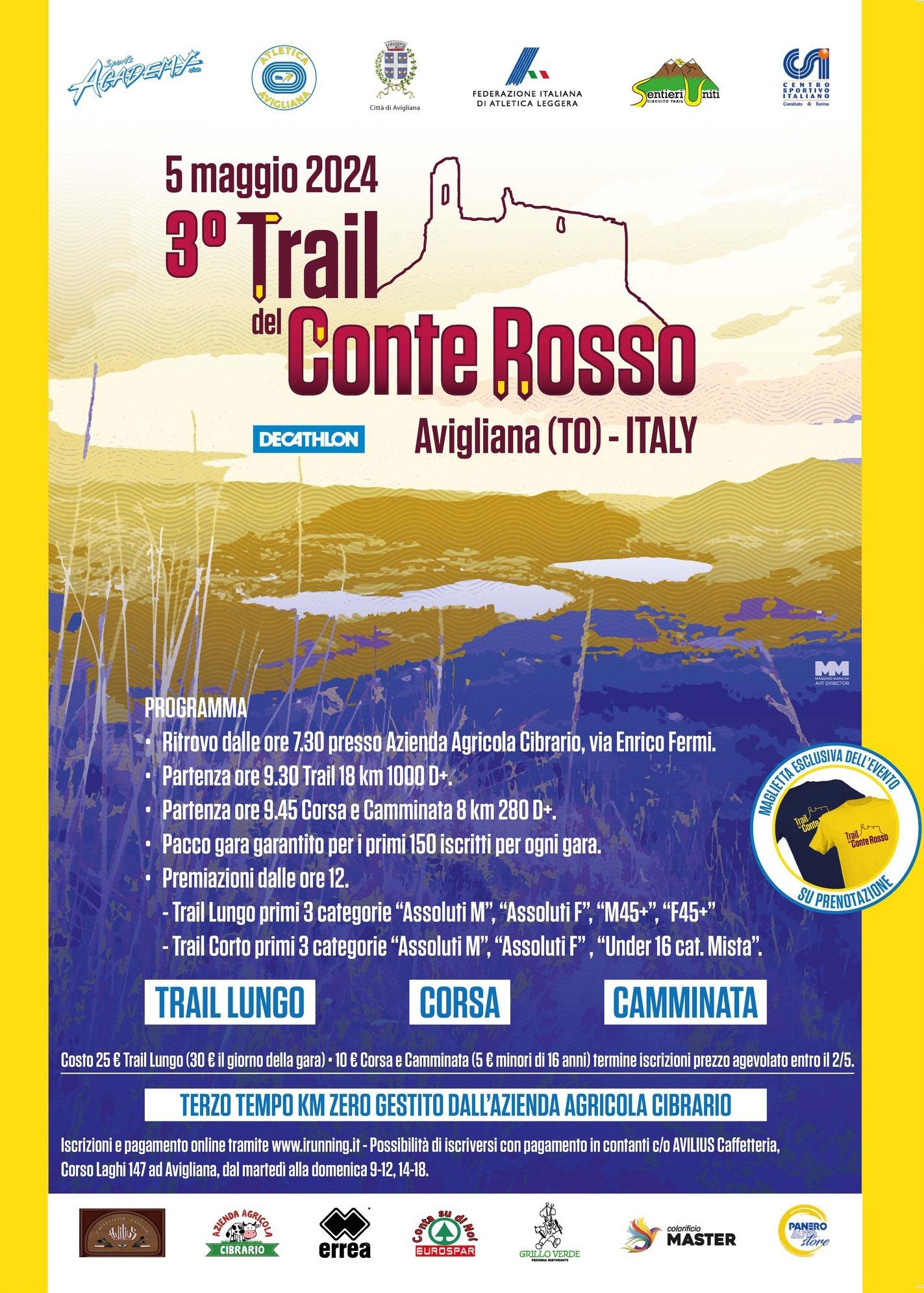 Avigliana, 30 aprile, 2024 – Sono attive fino a giovedì 2 maggio le iscrizioni agevolate per il 3° Trial del Conte Rosso, che si svolge domenica 5 maggio 2024 con ritrovo alle 7,30 all’azienda agricola Cibrario in via Enrico Fermi. La manifestazione si svolge con un programma differente per Trail lungo, corsa e camminata.
