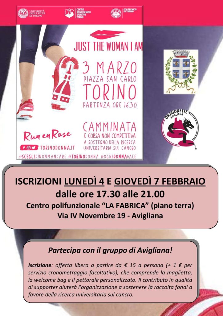 «Per il terzo anno consecutivo – spiega la vicesindaca di Avigliana Paola Babbini – Avigliana aderisce con un proprio team all’evento Just the woman I am, la camminata non competitiva, organizzata in occasione del 3marzo a sostegno della ricerca universitaria. È un evento non soltanto sportivo, ma con una forte valenza culturale e di socialità e lo sport universitario è impegnato a promuovere oltre ai temi della prevenzione, salute e benessere anche le pari opportunità in tutti gli ambiti della nostra società e riflettere sull’importanza di prendere una chiara posizione rispetto al fatto che la parità di genere debba essere un impegno comune».