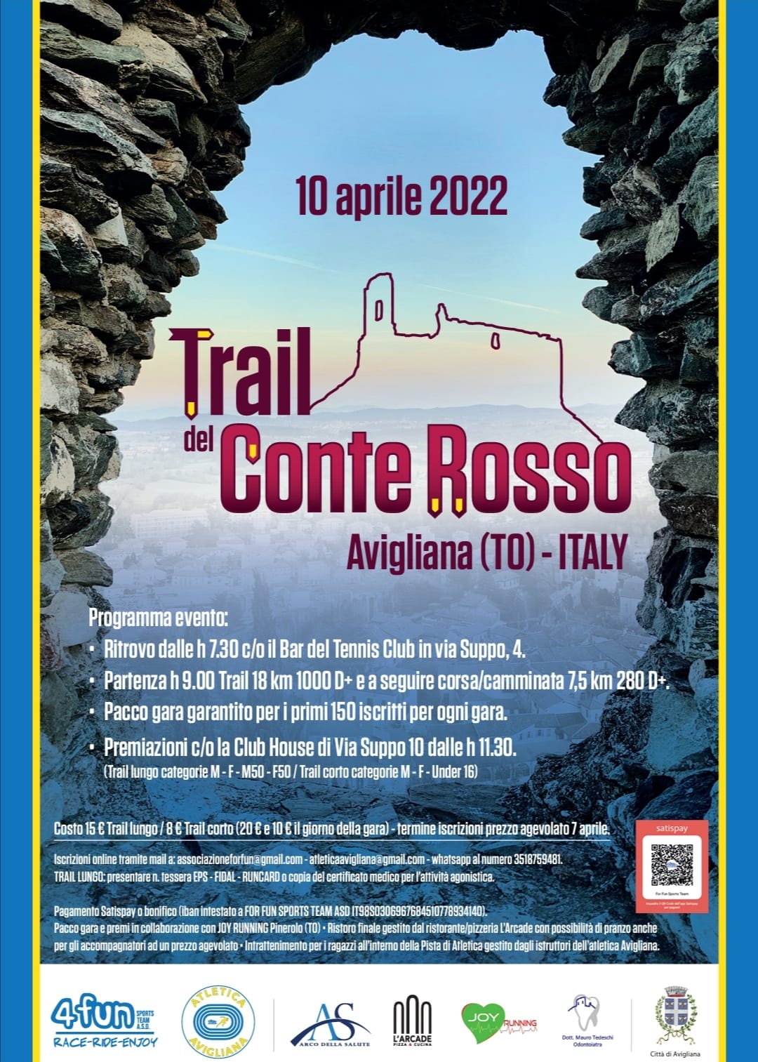 Il Comune di Avigliana, assessorato allo Sport, ha concesso il patrocinio alla prima edizione del Trail del Conte Rosso, manifestazione sportiva organizzata da 4Fun sports friends che prevede un percorso agonistico di 18km e 1000 metri di dislivello verso la Sacra di San Michele e una corsa/camminata per tutti di 7,5km con dislivello di 280 metri. Il trail si è svolto il 10 aprile 2022 con ritrovo dalle 7,30 al bar del Tennis club in via Suppo 4 e partenza alle 9 dai campi sportivi.