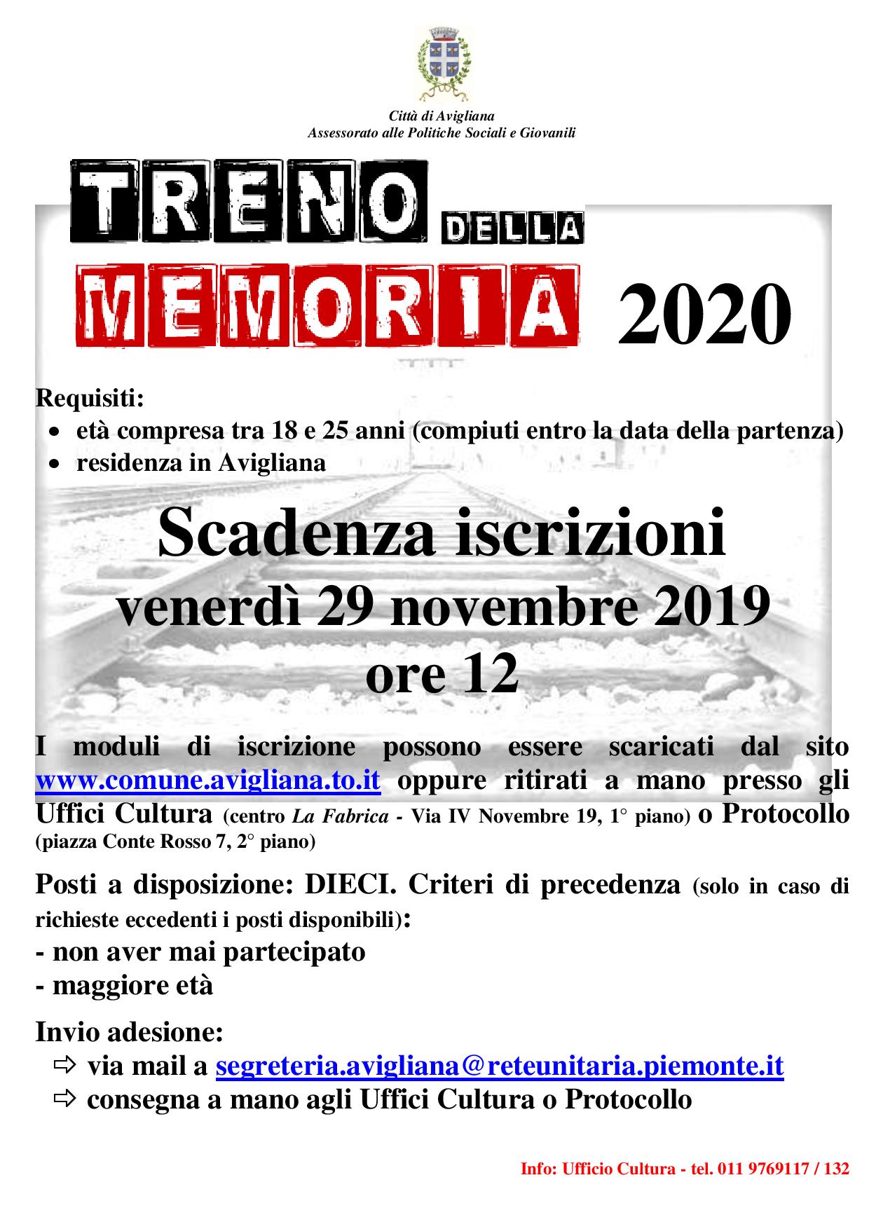 Sono aperte le iscrizioni per partecipare all’edizione 2020 del Treno della Memoria, riservato a 10 ragazzi di Avigliana dai 18 ai 25 anni d’età
