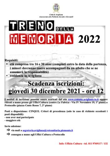 Avigliana, 22 dicembre 2021 – Anche quest’anno il Comune di Avigliana, attraverso l’assessorato alle Politiche sociali e giovanili, aderisce al Treno della Memoria. Potranno partecipare 5 ragazzi di Avigliana di età compresa tra i 16 e i 30 anni compiuti entro la data di partenza. Le iscrizioni all’edizione 2022 del Treno della Memoria scadono il 30 dicembre 2021 alle 12. I minori dovranno essere accompagnati da un adulto che se ne assumerà la responsabilità. In caso di richieste eccedenti, avrà precedenza sui posti disponibili chi non ha mai partecipato a questa iniziativa e chi è maggiorenne. I moduli completi di tutte le informazioni si possono scaricare qui e inviare via mail a segreteria.avigliana@reteunitaria.piemonte.it, oppure si possono ritirare e consegnare presso gli uffici Cultura e Protocollo.