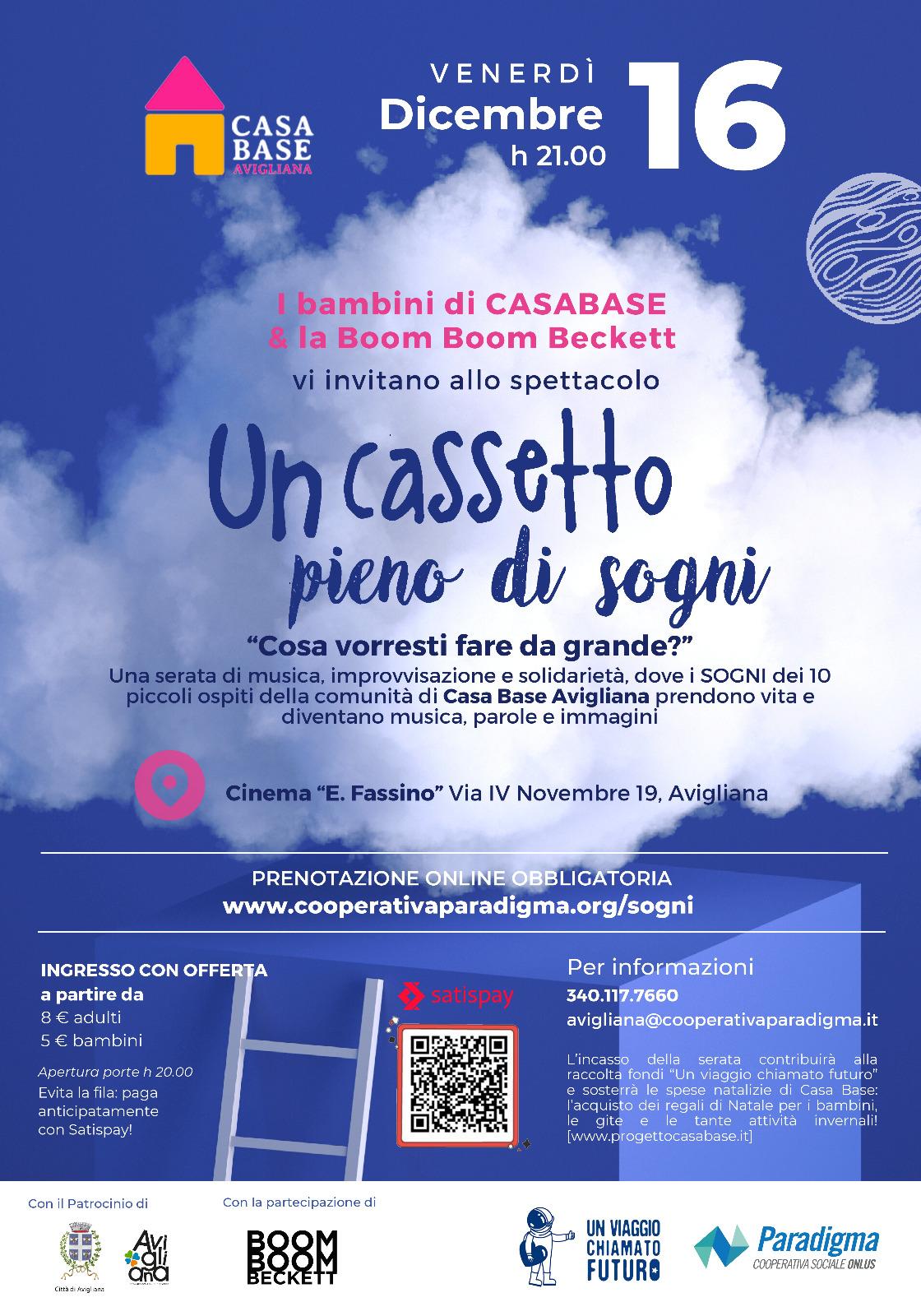 Il 16 dicembre 2022 al Teatro Fassino di Avigliana si terrà una serata di musica, improvvisazione e solidarietà, dove i sogni raccontati dai 10 piccoli ospiti della comunità di Casa Base Avigliana prenderanno vita per diventare immagini, parole e musica grazie alla band Boom Boom Beckett. L’ingresso è con offerta a partire da 8 euro per gli adulti e 5 euro per i bambini. Sarà una tappa importante nella grande raccolta fondi natalizia di Casa base. L’incasso della serata contribuirà alla raccolta fondi “Un viaggio chiamato futuro” e sosterrà le spese natalizie di Casa base: l’acquisto dei regali di Natale per i bambini, le gite e le tante attività invernali. La prenotazione è obbligatoria online.