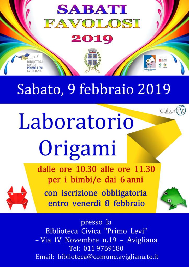 La magia degli origami in un laboratorio per bambini dai 6 anni in su. Sabato 9 febbraio presso la biblioteca civica Primo Levi in via IV Novembre 19 ad Avigliana, dalle ore 10,30 alle ore 11,30 i bimbi sono invitati a partecipare all’appuntamento dedicato all’arte giapponese di piegare la carta per costruire piccoli animali e altre figure. L’iscrizione è obbligatoria entro venerdì 8 febbraio.