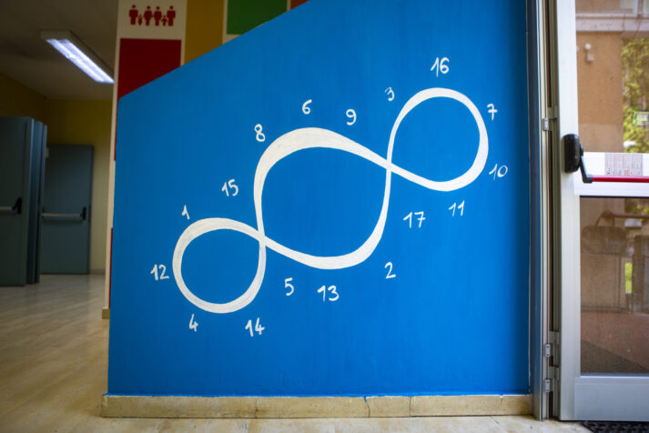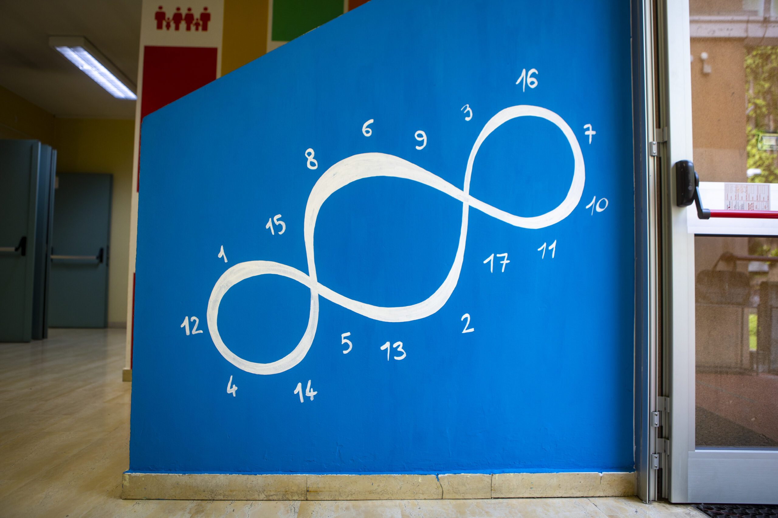 ​ Nell’ingresso dell’Istituto tecnico commerciale e per geometri Galileo Galilei di Avigliana invece ricoprono interamente le pareti, poiché ogni intervento è correlato allo spazio. Nello stesso ingresso dell’Istituto, completa il wall painting il segno-simbolo del Terzo Paradiso – in omaggio al progetto condiviso di Michelangelo Pistoletto – qui circondato dai numeri che vanno dall’1 al 17, un richiamo all’Agenda 2030 e un rinnovato impegno nella Valle attestato dalla presenza del Terzo Paradiso in diversi luoghi, dal Forte di Exilles al Polo Sanitario di Avigliana».