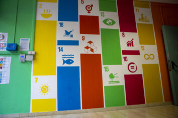​ Una delle prime attività condivise nell’ambito del Patto di Comunità è stata la creazione dei due murales ispirati all’Agenda Onu 2030 e ai 17 Obiettivi per lo Sviluppo sostenibile, uno sulla facciata della Defendente Ferrari e uno all’ingresso della succursale del Galilei.